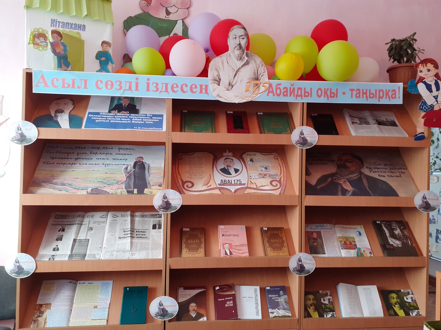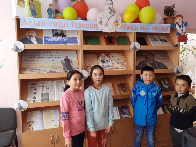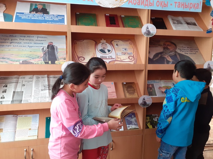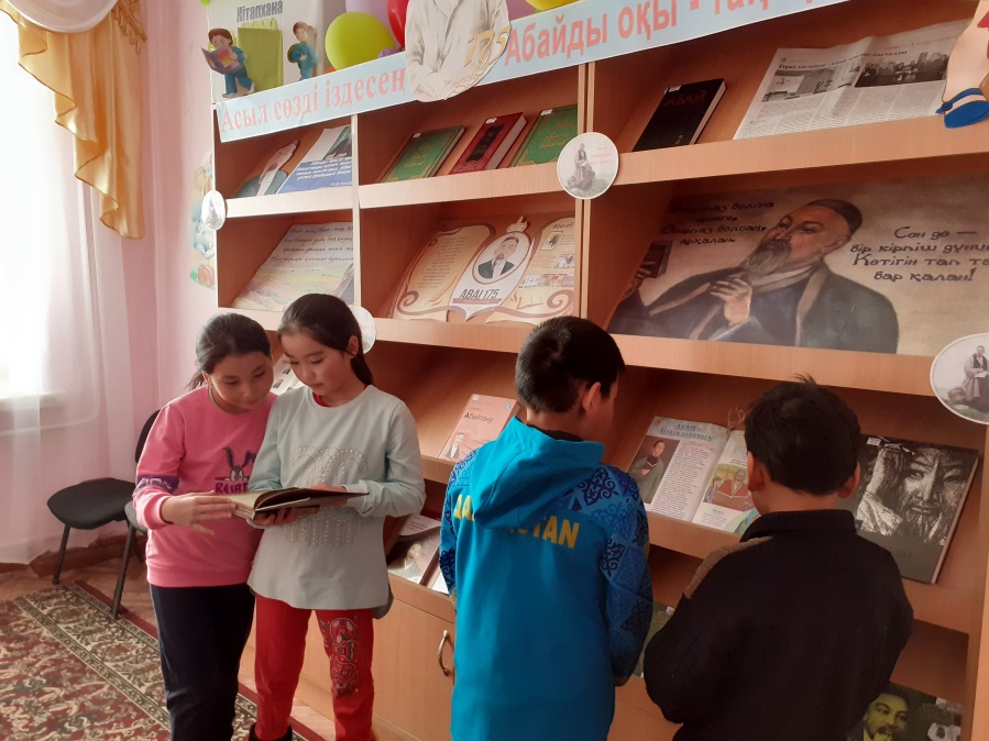 Кітап көрмесі жас ұрпақтың, оқырмандардың кітапқа деген қызығушылықтарын арттырып, Абайды оқуға, Абайдың қара сөздерін, өлеңдерін түсіну мақсатында ұйымдастырылды. Көрмеге Абай атамыз жайлы жазылған мақалалар, өмірбаяны, фото суреттер, нақыл сөздер және кітаптары қойылды. Б.Ердембековтың «Абайтану», М.Әуезоа «Абай жолы», Д.Омаров «Абайдың рухани мұрасы», Ғ.Есім «Хаким Абай», «Абай туралы сөз», «Абай слова назидания», «Абай Қара сөз» атты жинақтар оқырмандар назарына ұсынылды. Көрмеге 21 оқырман қатысты.