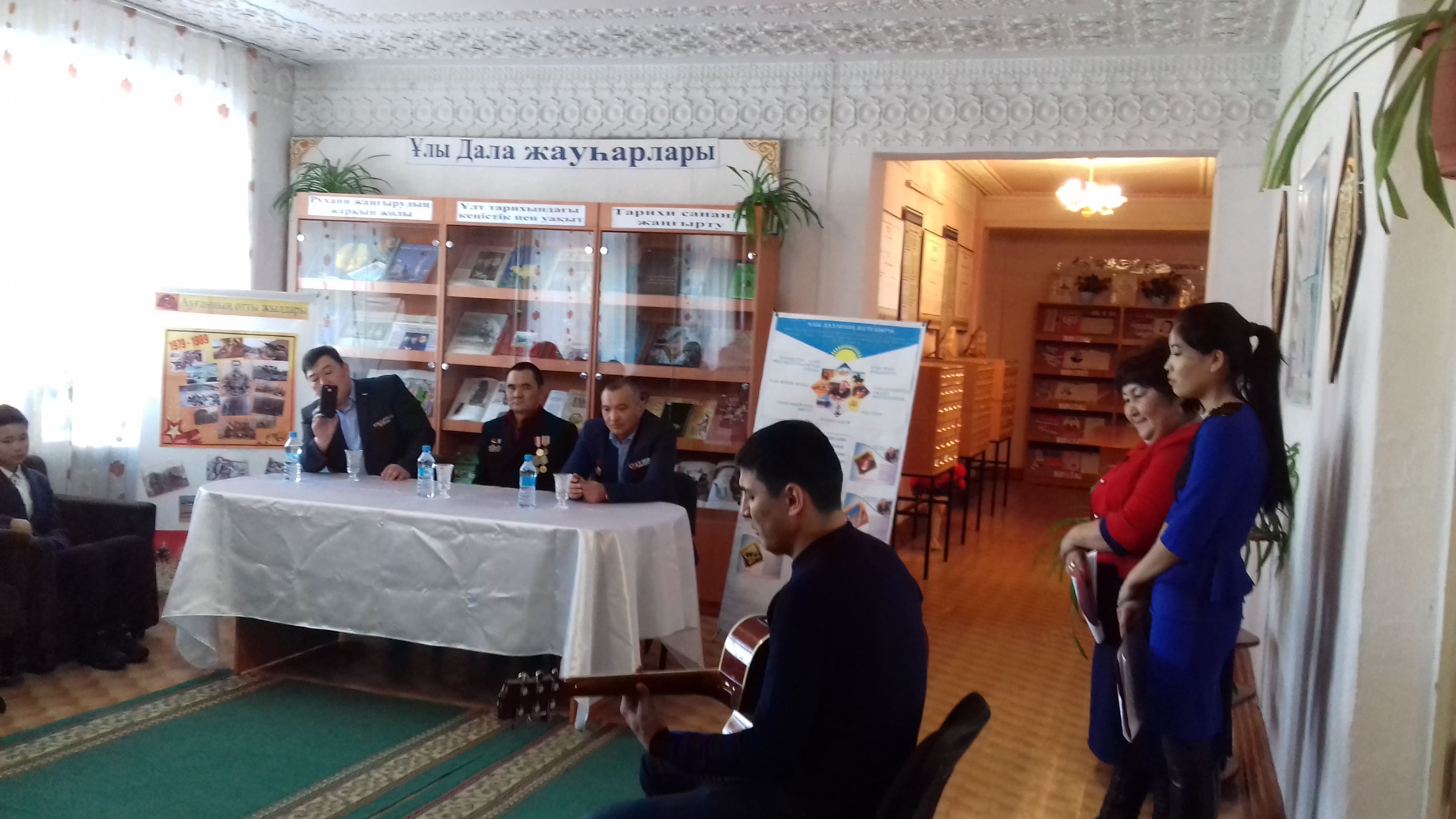 Оқушылар ардагерлерге көкейлеріндегі сұрақтарын қойып, өлең-шумақтарынан әдеби монтаж ұсынды. Родина ауылының тұрғыны, кітапханамыздың тұрақты оқырманы Шаяхмет Серікболсын кеш қонақтарына арнап гитарамен ән салып кештің сәнін келтірді.