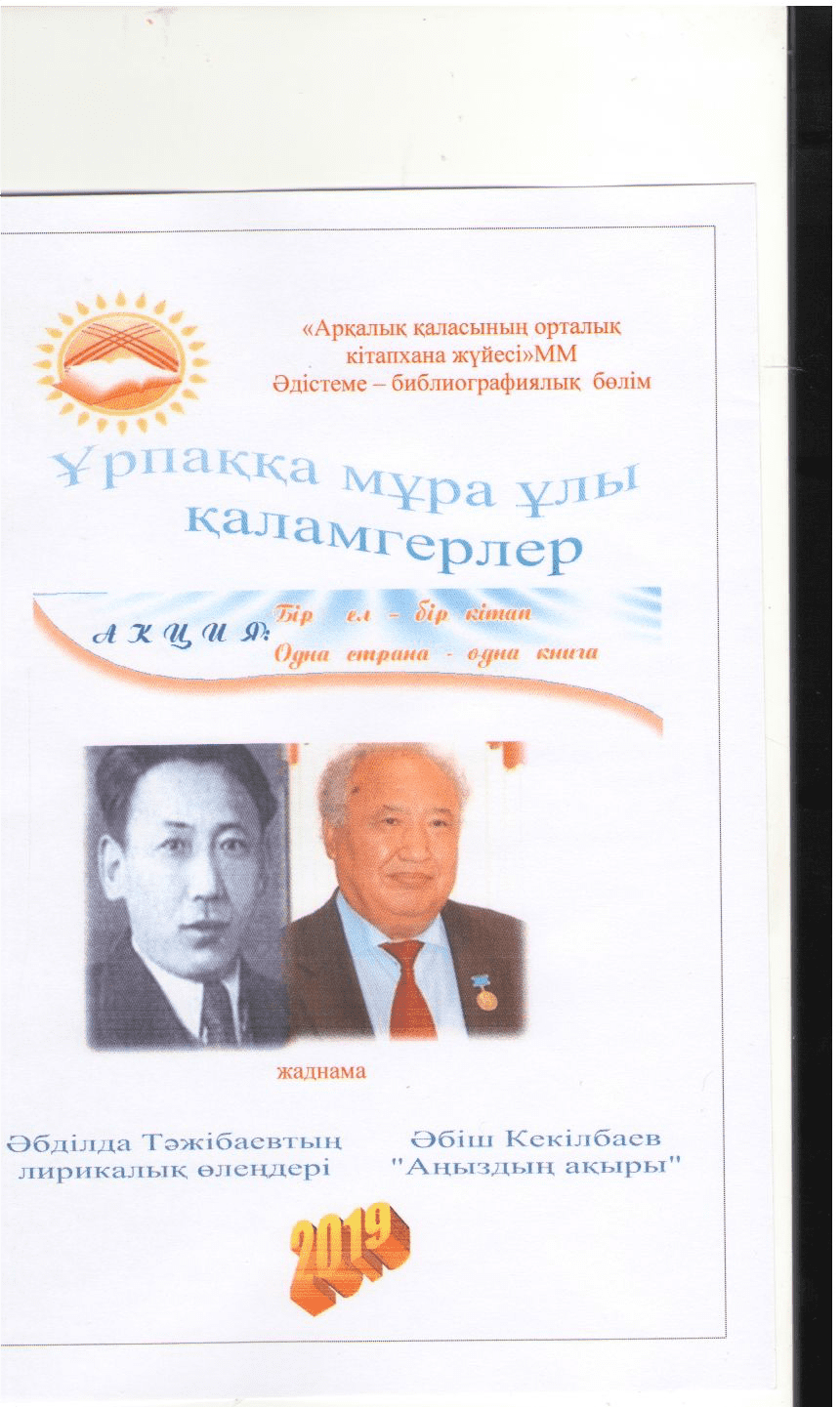 Орталық кітапханада «Бір ел – бір кітап - 2019» республикалық акциясына арналған «Ұрпаққа мұра ұлы қаламгерлер» атты жаднама құрастырылды.
