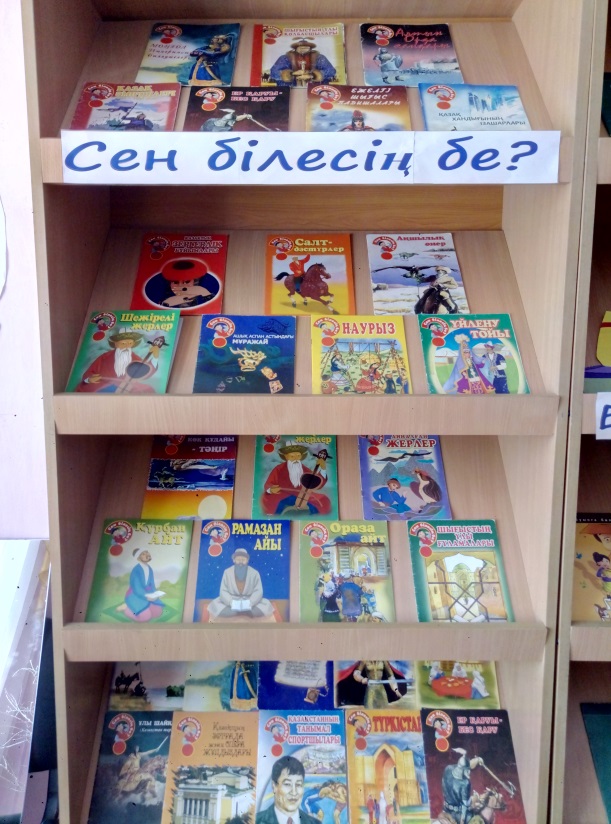 1бөлім: «Сен білесің бе?» атты тарихи-этнографиялық кітаптар топтамасынан құралды. Мұнда қазақ халқының салт дәстүрлері, шежірелі жерлері, аңызға айналған жерлері., алтын орда хандары, шығыстың ұлы ғұламалары, ұлы шайқас атты шағын кітапшалары қойылса,