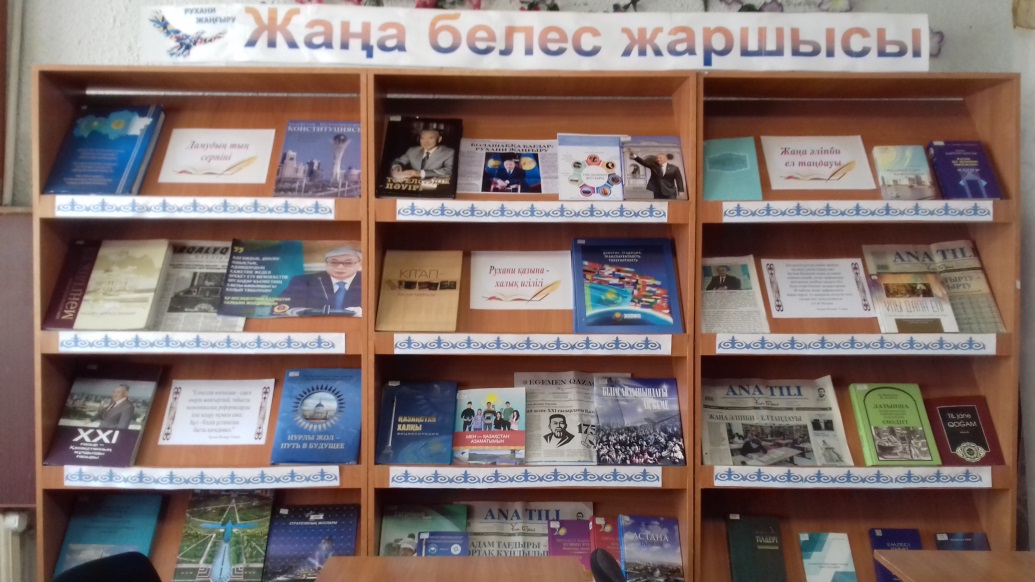 Көрменің екінші бөлімі «Рухани қазына – халық игілігі» деп аталады. Бұл бөлімде Елбасы Н. Ә. Назарбаевтың «Рухани жаңғыру –болашаққа бағдар», «Ұлы даланың жеті қыры» мақалаларын басшылыққа ала отырып, рухани қазыны –халқымыздың игілігі туралы, Қазақстанның өркениетті елдер қатарында, жеткен жетістігімізді айқындайтын, рухани азық әдебиеттерден кітап көрмесі ұйымдастырылды. Көрмеде Ұлы дала тарихын, ғылым, білім, мәдениет пен табиғатын, ұлы даланың ұлы есімдерін қамтитын әдебиеттер және Абайдың 175 жылдығына орай рухани қазынамызды кеңейту мақсатында Ұлыларды ұлықтау туралы Мемлекет басшысы Қ. Тоқаевтың баспасөз басылымдарындағы мақаласы орналастырылып насихатталуда.