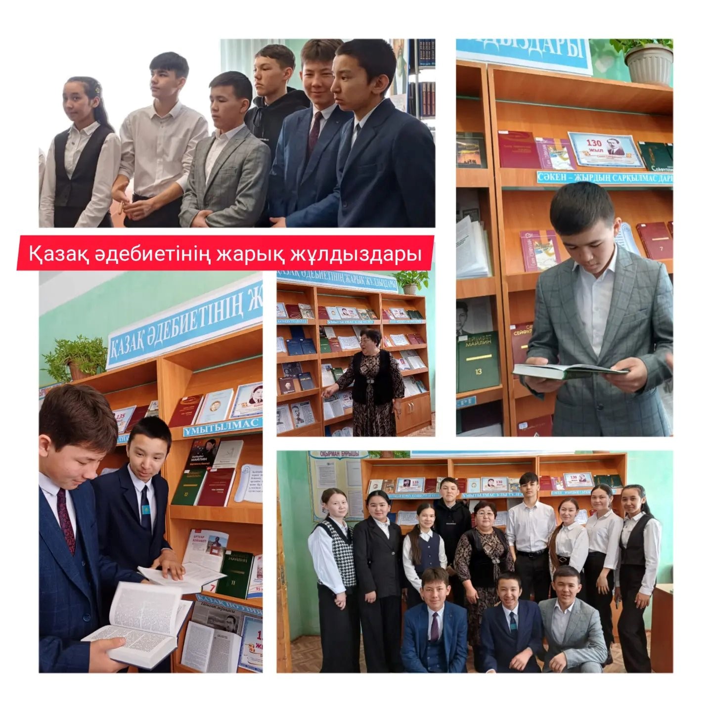 қазақ әдебиетінің қалыптасуына елеулі еңбек сіңірген қазақтың көрнекті жазушылары Жүсіпбек Аймауытовтың 135 жылдығына ''Халқым деп соққан жүрегі, қазаққа туған ұл еді'' және қазақтың үш бәйтерегі ''Ұмытылмас ұлы тұлға''Бейімбет Майлиннің, ''Қазақ поэзиясының құлагері'' Ілияс Жансүгіровтің, ''Сәкен - жырдың сарқылмас дариясы'' Сәкен Сейфулиннің 130 жылдық мерейтойларына арналып жасақталды. Көрмеге қойылған мерейтой иелерінің шығармалары, олар туралы жазылған әдебиеттер' баспасөз беттеріне жарияланған материалдарға шолу жасалып, жас оқырмандарға таныстырылды.