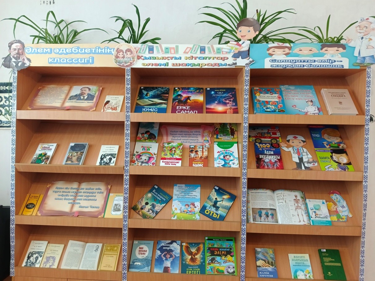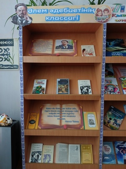 Ұлы Ресей жазушысы, драмматург, прозашы Антон Павлович Чеховтың 165 жыл толуына орай «Әлем әдебиетінің классигі» тақырыбында арнау көрме ұйымдастырылды. Көрмеге ақынның өмірбаяны, нақыл сөздері мен фотосуреттері және «Толстый и тонкий», «Учитель словесности», «Чайка, Вишневый сад», «Каштанка», «Тайный советник» атты жинақтары қойылды. Келген оқырмандарды жазушының өмірімен шығармашылығымен таныстырып, көрмедегі кітаптарына шолу жасалынып, оқырмандар назарына ұсынылды.