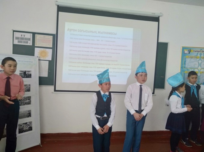 Екідің ауыл кітапханасында Ауғаныстанның 30 жылдығына арналған “Ауғанның от жалыны” атты тақырыптық кеш өтті. Кеш Ауған соғысынан оралмаған боздақтарды бір минут үнсіздік пен еске алумен басталды. Тарих пәнінің мұғалімі Рахымет Рахима “Ауғанстан жазылмас” тақырыбында баяндама оқып, 6-7 сынып оқушылары ардагерлерге арнап жазылған өлең жырларын оқып, ән салып, би биледі. Сондай-ақ “Ауғанстан жүректегі жара” тақырыбында слайд көрсетіп, көрермендерге осы соғысқа қатысқан жауынгерлер діңерліктері туралы айтып бердім. Сонымен қатар «Қара майор» атанған Б.Керімбаевтың Ауған соғысы кезіндегі ерліктері мен естеліктері жайлы баяндалды. Кештің негізгі мақсаты жастарды отан сүйгіштікке тәрбиелеу, патриоттық сезімін ояту болып табылады.