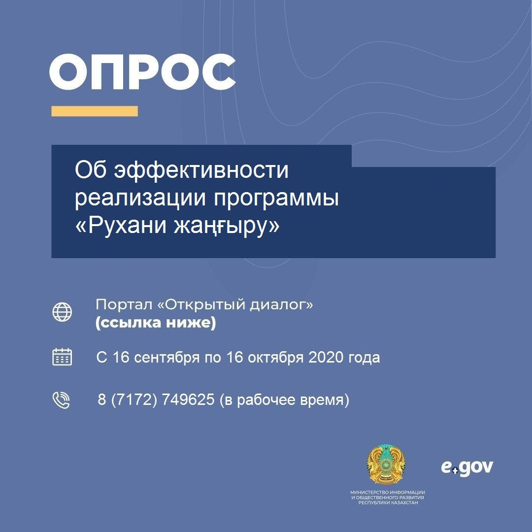 Министерство информации и общественного развития Республики Казахстан сообщает, что на интернет-портале "Открытый диалог" опубликована анкета на тему "об эффективности реализации программы" Рухани жаңғыру".